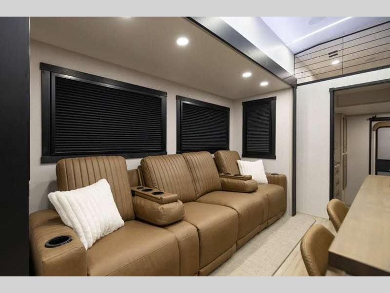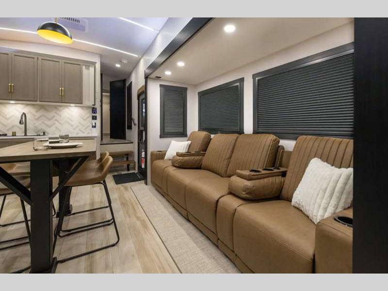 Sleeps 7 Slides 5 Length 43 ft 9 in Ext Width 8 ft 5 in Ext Height 13 ft 5 in Int Height 6 ft 8 in Hitch Weight 2830 lbs Dry Weight 15044 lbs Cargo Capacity 2951 lbs Fresh Water Capacity 57 gals Grey Water Capacity 78 gals Black Water Capacity 78 gals Available Beds Two Custom King Refrigerator Type 12V Refrigerator Size 20 cu ft Cooktop Burners 4 Number of Awnings 1 Water Heater Type On Demand Tankless AC BTU 45000 btu TV Info LR 65" LED Smart TV Awning Info 20' with LED Lights Axle Count 2 Washer/Dryer Available Yes Shower Type Shower w/Seat Similar Floorplans