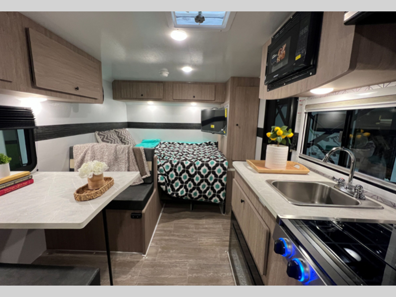 Sleeps 3 Length 21 ft 8 in Ext Width 8 ft 6 in Ext Height 8 ft 11 in Int Height 6 ft 4 in GVWR 3600 lbs Dry Weight 2580 lbs Cargo Capacity 774 lbs Fresh Water Capacity 25 gals Grey Water Capacity 30 gals Black Water Capacity 30 gals Tire Size 14" Cooktop Burners 2 Number of Awnings 1 LP Tank Capacity 20 lbs Awning Info Power Axle Count 1 Number of LP Tanks 1 Shower Type Standard Similar Floorplans