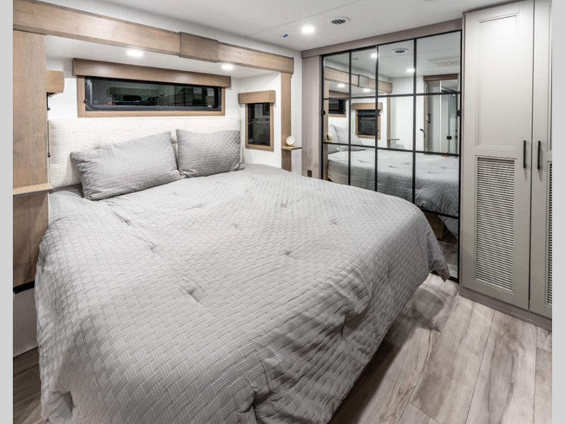 Sleeps 4 Slides 2 Length 33 ft 6 in Ext Width 8 ft Ext Height 12 ft 6 in Interior Color Mink, Pebble Hitch Weight 2070 lbs GVWR 12995 lbs Dry Weight 9910 lbs Cargo Capacity 3085 lbs Fresh Water Capacity 76 gals Grey Water Capacity 90 gals Black Water Capacity 50 gals Tire Size 16" Furnace BTU 35000 btu Available Beds King Refrigerator Type Residential Refrigerator Size 18 cu ft Convection Cooking Yes Cooktop Burners 4 Shower Size 48" x 30" Number of Awnings 1 Axle Weight 7840 lbs LP Tank Capacity 30 lbs Water Heater Type On Demand Tankless AC BTU 15000 btu TV Info LR 50" Smart LED TV Awning Info 20' Power w/LED Light Strip Axle Count 2 Washer/Dryer Available Yes Number of LP Tanks 2 Shower Type Shower w/Seat Electrical Service 50 amp Similar Floorplans