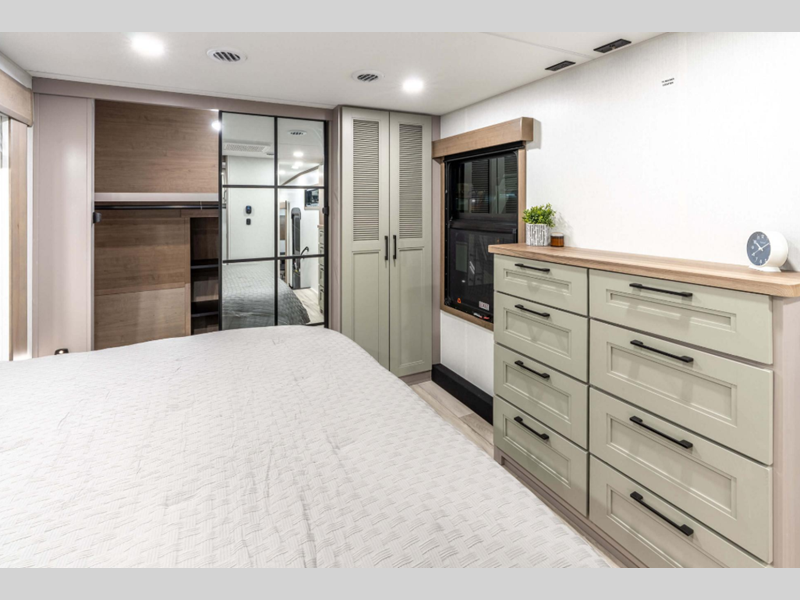Luxury bedrooms, a durable Towing Package, and a deluxe heated convenience center are just some of the reasons you should choose them. They are built for the unbound with a steel powder coated I-beam, a Lamilux® gelcoat fiberglass, and Pex® in-floor heated waterlines. The improved RV Airflow system provides quiet cooling and the All Weather Insulation Package means you'll be ready for any season.
