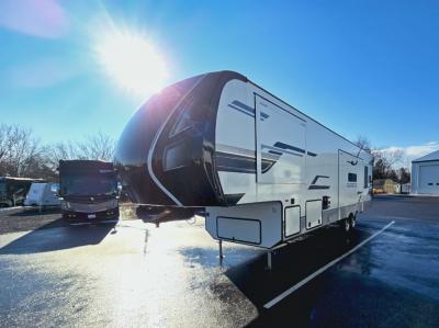 Sleeps 4 Slides 3 Length 37 ft 11 in Ext Width 8 ft Ext Height 12 ft 11 in Interior Color Mink, Pebble Hitch Weight 2160 lbs GVWR 14500 lbs Dry Weight 12420 lbs Cargo Capacity 2080 lbs Fresh Water Capacity 76 gals Grey Water Capacity 50 gals Black Water Capacity 50 gals Tire Size 16" Furnace BTU 35000 btu Available Beds King Refrigerator Type Residential Refrigerator Size 18 cu ft Convection Cooking Yes Cooktop Burners 4 Number of Awnings 1 Axle Weight 10260 lbs LP Tank Capacity 30 lbs Water Heater Type On Demand Tankless AC BTU 15000 btu TV Info LR 43" Smart LED TV Awning Info 16' Power w/LED Light Strip Axle Count 2 Washer/Dryer Available Yes Number of LP Tanks 2 Shower Type Shower w/Seat Electrical Service 50 amp Similar Fifth Wheel Floorplans